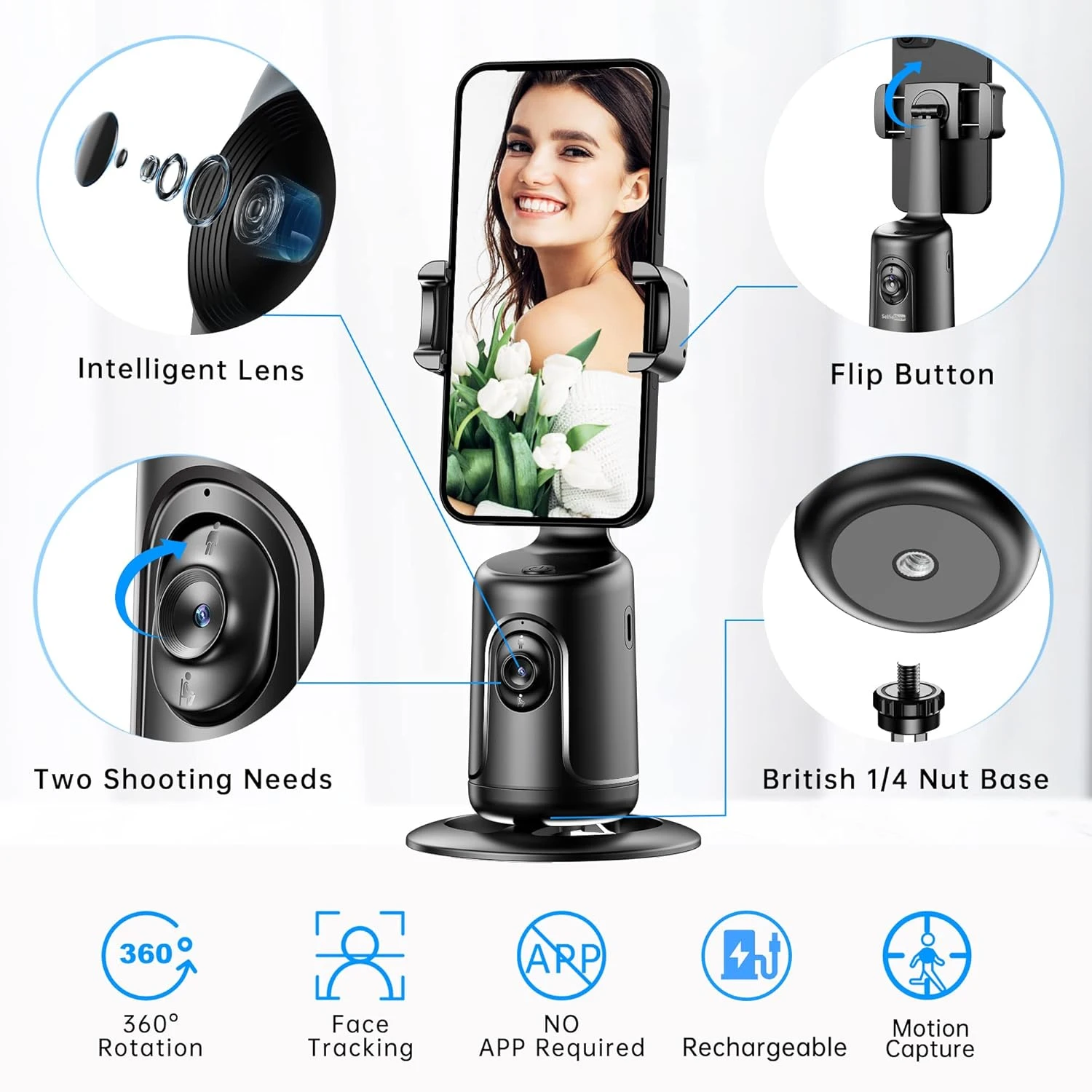 Designed with built-in AI face recognition, a stable tripod base, extendable selfie stick, and silent rotation motor—giving you professional, studio-like video quality anywhere.